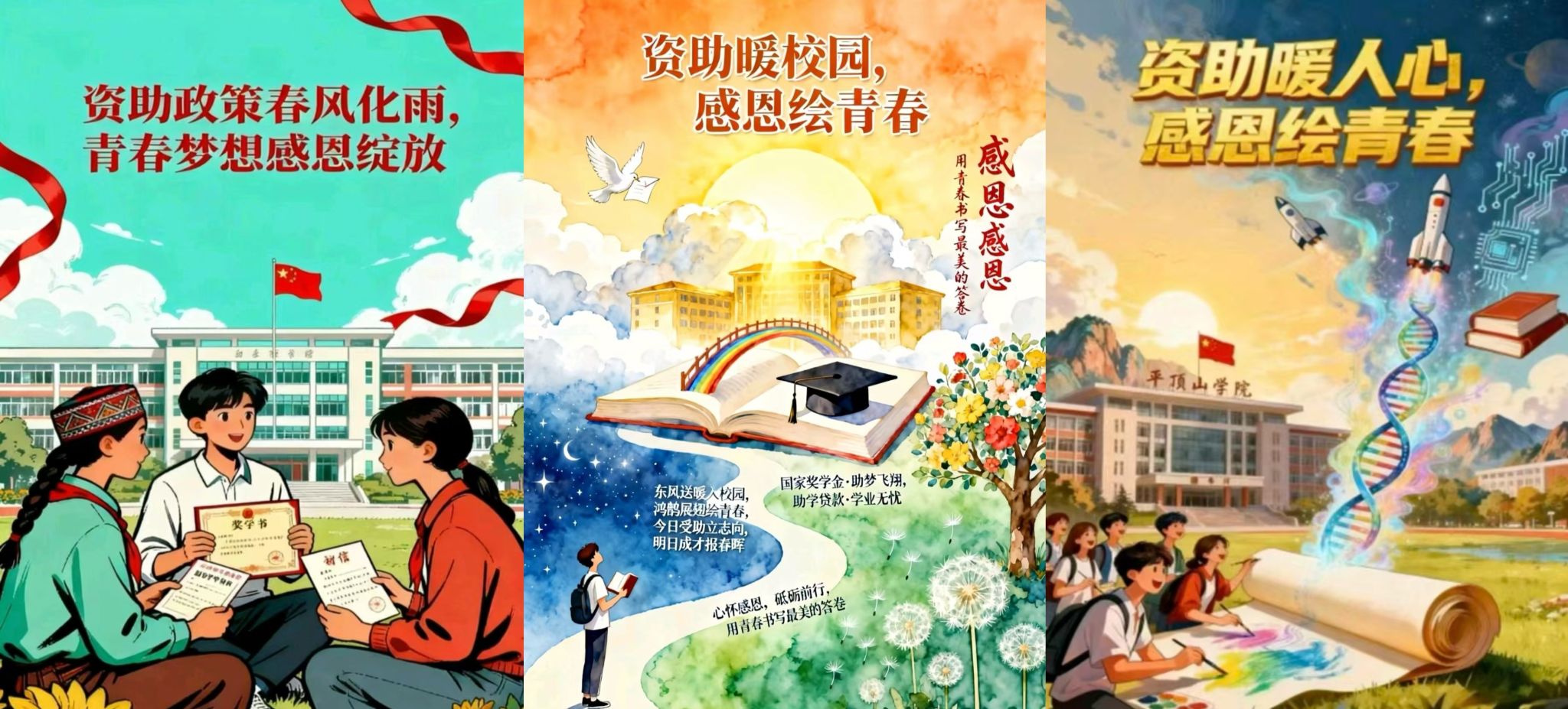受助学子积极参与,以画笔和创意描绘心声。一幅幅海报以多样的视觉语言,述说着对国家资助政策的真挚感谢,记录从“求学无忧”到“逐梦前行”的成长历程,将“资助暖心田”的感动与“青春勇担当”的信念凝于线条与色彩之中。