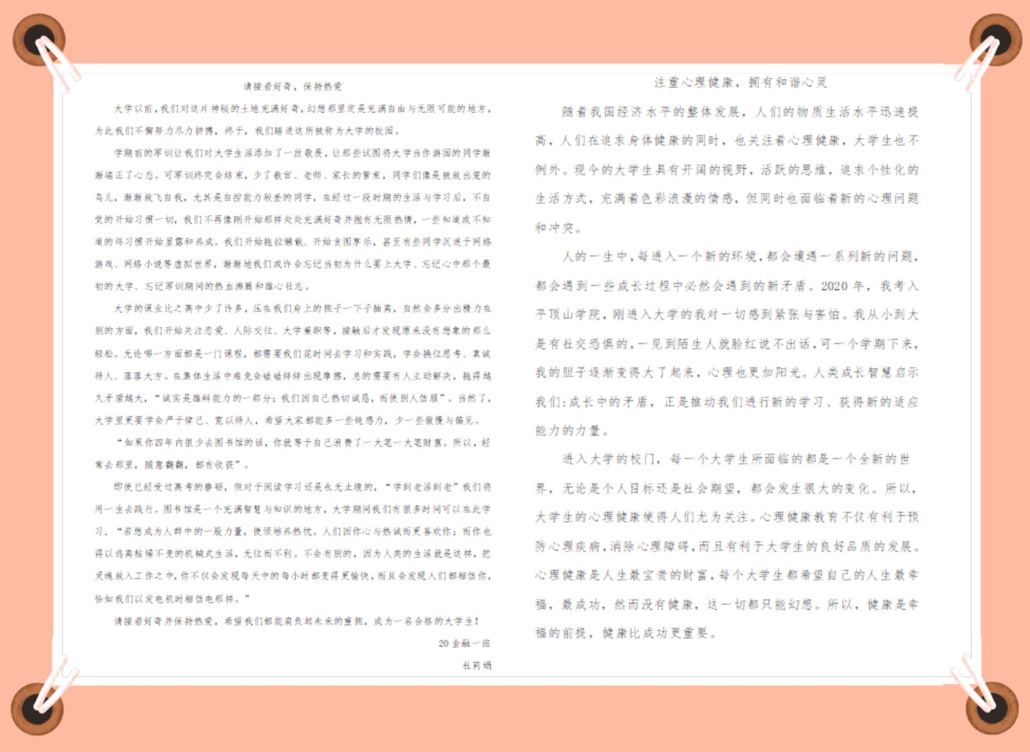 本次心理特色品牌活动,同学们积极参与,收获颇丰。共有89名同学参赛,收到征文作品61份,绘画作品28份。同学们通过心理美文、漫画的形式将生活中应对挫折的心路历程、心理调适的过程、走出心理困境的方法展现和分享给大家,诠释“阳光心灵”,宣传了心理健康知识,营造了积极向上、青春活力的校园文化氛围。不仅培养了学生的兴趣,而且开发学生的潜能,展现了学生的才能,让他们更加自信地展示自我。