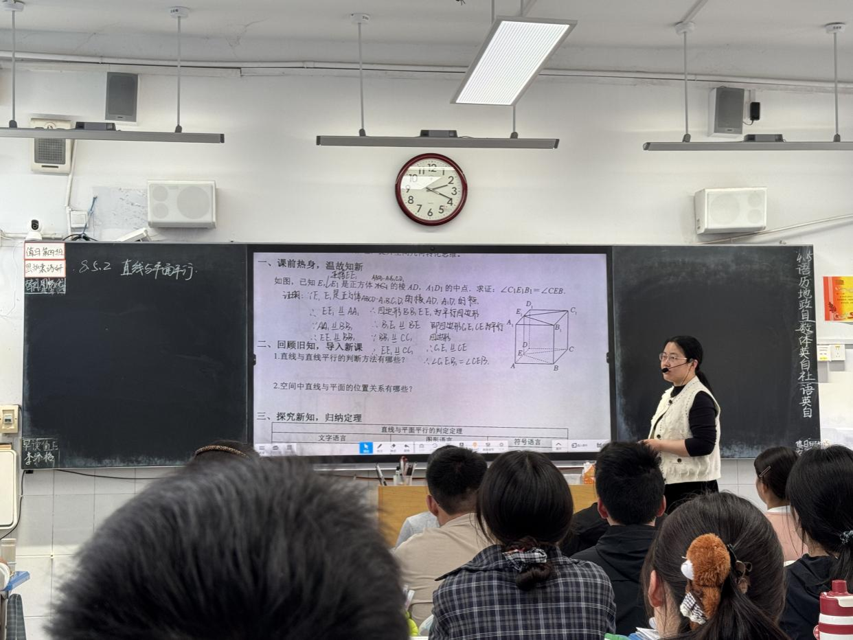 活动当天,工作坊学员现场观摩了由高一年级谢倩澜老师执教的数学示范课《直线与平面平行》。谢老师以生动的实际生活案例为载体,围绕教学重点与难点展开知识讲授,充分体现了“以学生为主体”的教学理念。课堂上,谢老师巧妙设置问题情境,通过趣味性强的实际案例分析,循序渐进地引导学生深入理解抽象的数学概念,启发学生自主思考、合作讨论,并鼓励他们积极参与课堂互动,真正实现了“教学评一致性”的有效落地。整节课气氛活跃,展现了平顶山市第一中学教师扎实的教学功底和先进的教育理念。
