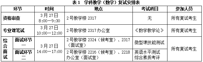 我院一志愿复试时间为2026年3月27日,全部采用现场复试的方式,复试具体时间、地点详见表1: